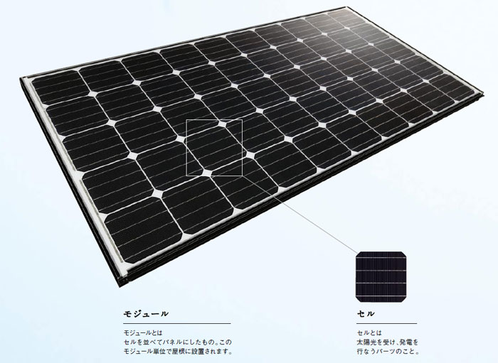 この小さな板のことをセルと呼び、実際に発電しているのは「セル」になります。
